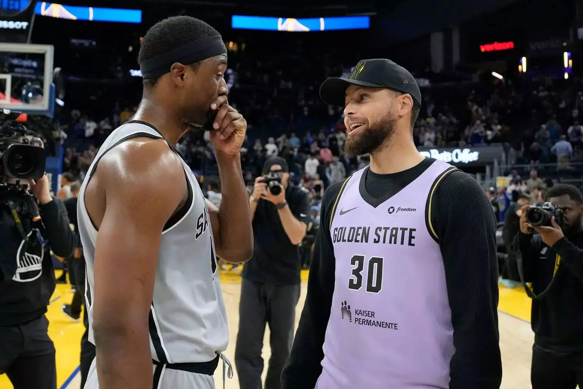 Injured Golden State Warriors guard Stephen Curry, right, talks with San Antonio Spurs forward Harrison Barnes after an NBA basketball game in San Francisco, Wednesday, April 1, 2026. (AP Photo/Tony Avelar)