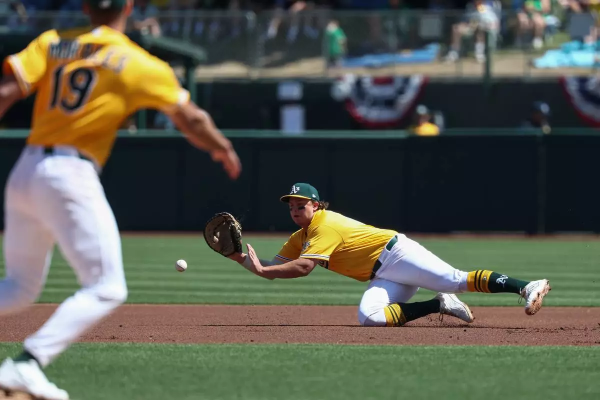 Athletics first baseman Nick Kurtz, right, dives for a ball hit by Houston Astros' Christian Walker (not shown) during the first inning of a baseball game Saturday, April 4, 2026, in West Sacramento, Calif. (AP Photo/Sara Nevis)