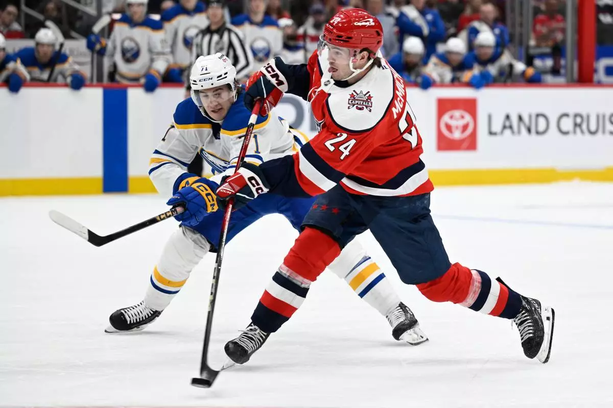 Washington Capitals left wing Connor McMichael (24) shoots the puck past Buffalo Sabres center Ryan McLeod during the first period of an NHL Hockey game, Saturday, April 4, 2026, in Washington. (AP Photo/John McDonnell)