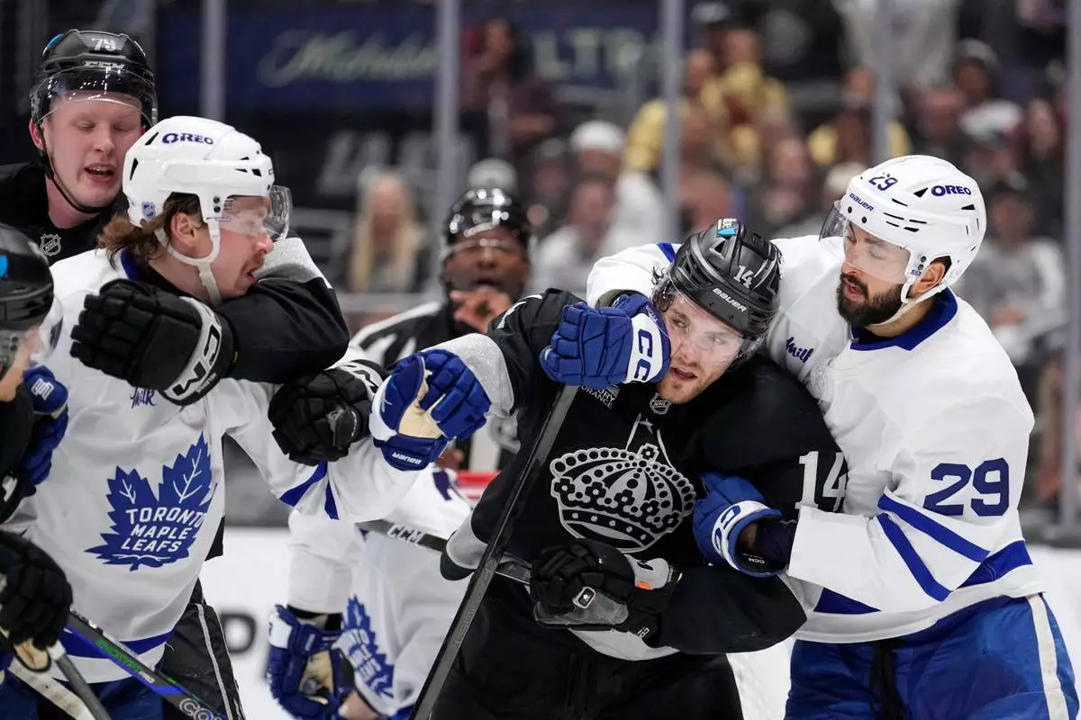 Los Angeles Kings center Samuel Helenius, left, and Toronto Maple Leafs defenseman Simon Benoit, second from left, scuffle as right wing Alex Laferriere, second from right, and center Bo Groulx also scuffle during the second period of an NHL hockey game Saturday, April 4, 2026, in Los Angeles. (AP Photo/Mark J. Terrill)