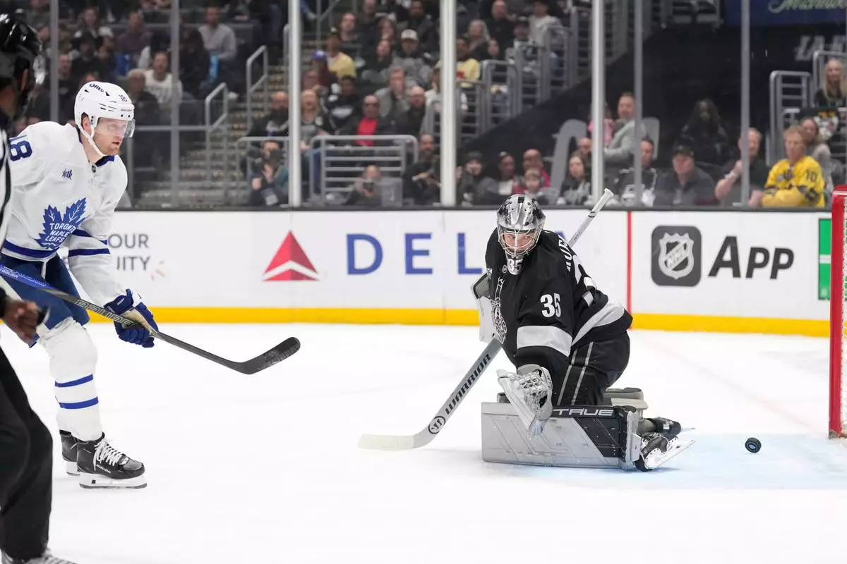 Toronto Maple Leafs center Steven Lorentz, left, scores on Los Angeles Kings goaltender Darcy Kuemper during the first period of an NHL hockey game Saturday, April 4, 2026, in Los Angeles. (AP Photo/Mark J. Terrill)