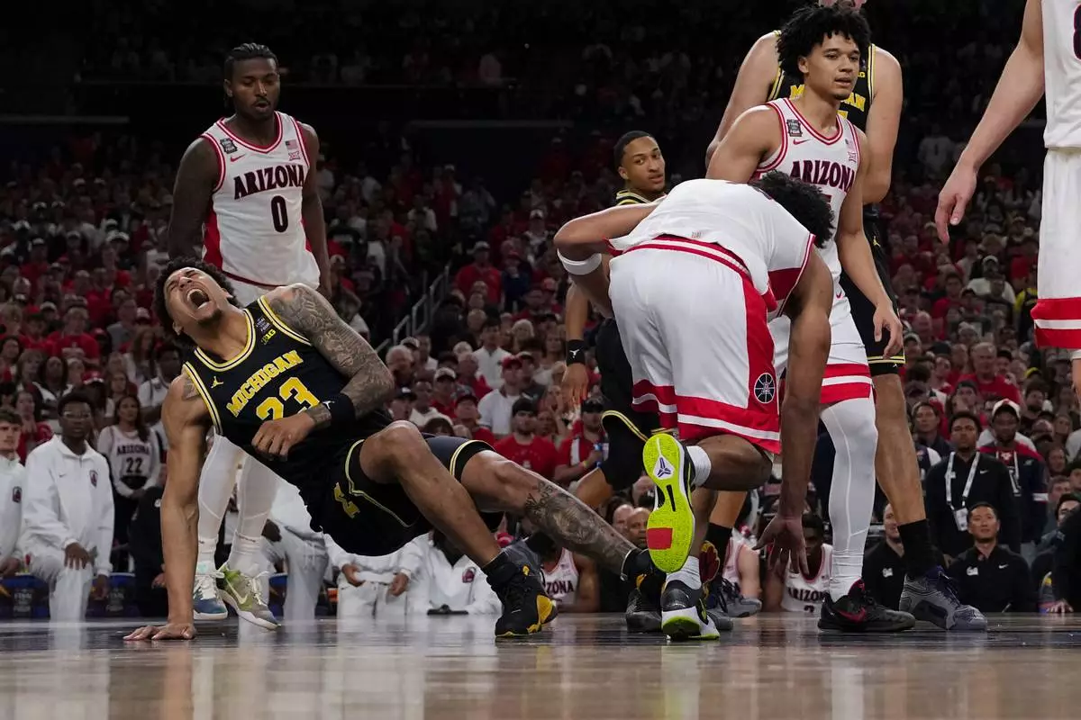 Michigan forward Yaxel Lendeborg (23) falls after play against Arizona during the first half of an NCAA college basketball tournament semifinal game at the Final Four, Saturday, April 4, 2026, in Indianapolis. (AP Photo/Abbie Parr)
