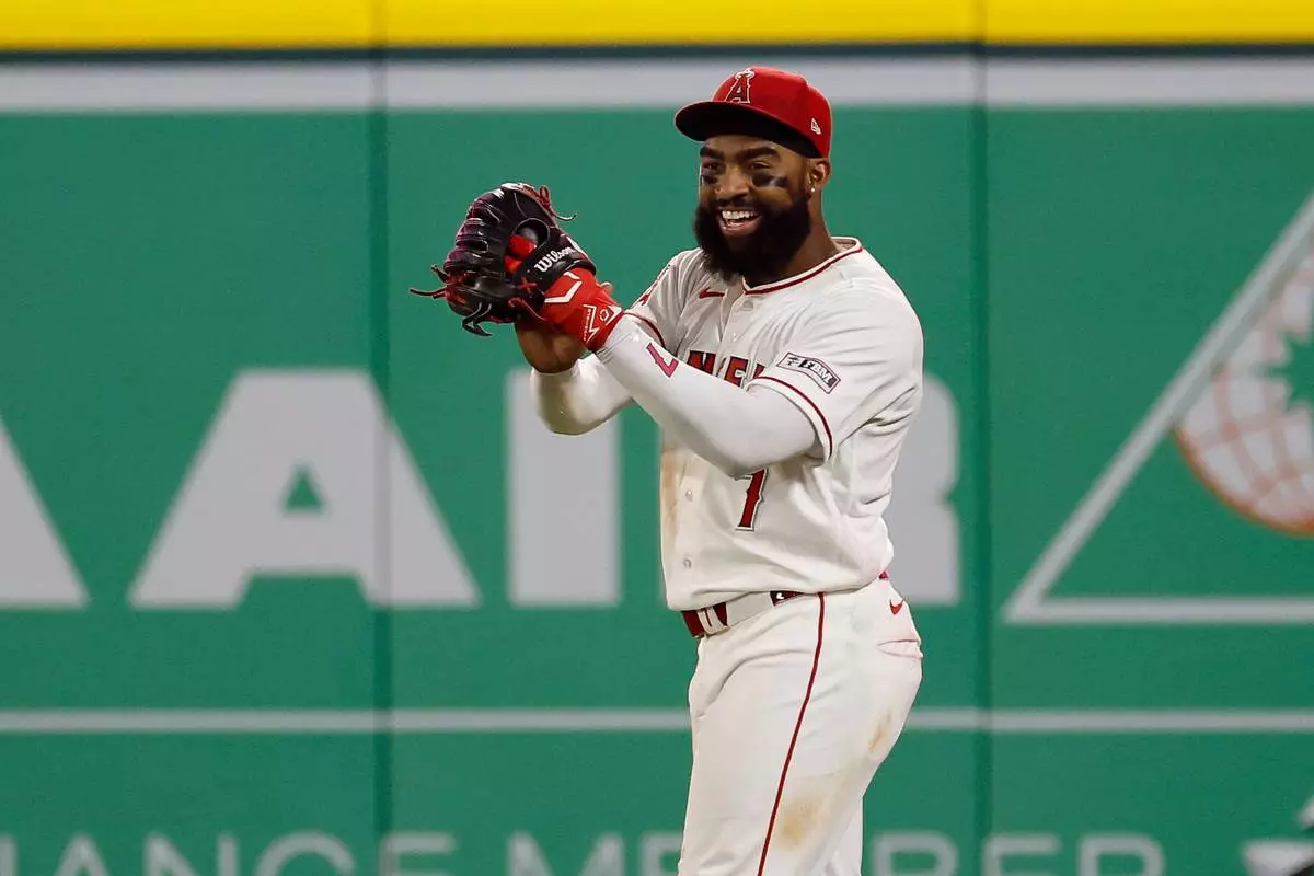 Los Angeles Angels left fielder Jo Adell (7) reacts after catching a ball hit by Seattle Mariners' J.P. Crawford during the ninth inning of a baseball game Saturday, April 4, 2026, in Anaheim, Calif. (AP Photo/Caroline Brehman)