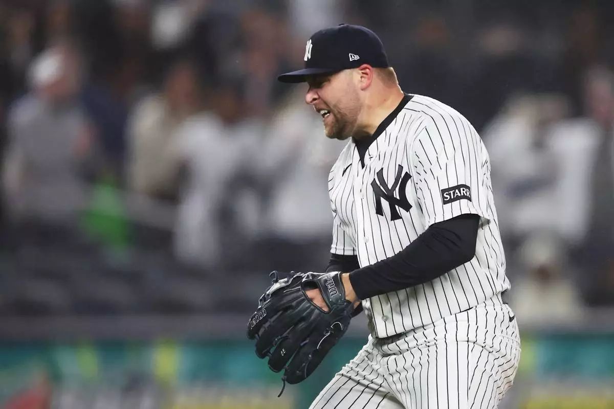 New York Yankees pitcher David Bednar reacts after a strikeout to end the game in the ninth inning of a baseball game against the Miami Marlins, Saturday, April 4, 2026, in New York. (AP Photo/Heather Khalifa)