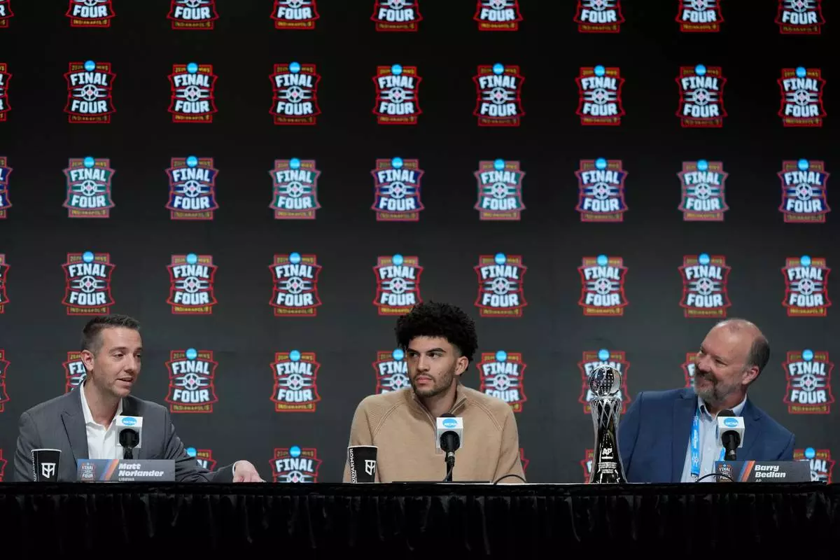 Associated Press Director of Global Text & Communication Production Barry Bedlan, right, and Duke forward Cameron Boozer listen as USBWA representative Matt Norlander, left, speaks after announcing the Oscar Robertson Player of the Year awarded by the Associated Press and the U.S. Basketball Writers Association during a news conference at the Final Four NCAA basketball tournament, Sunday, April 5, 2026, in Indianapolis. (AP Photo/Jeff Roberson)