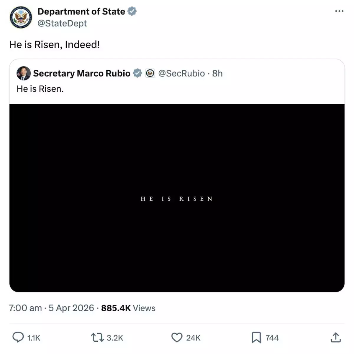 “He is risen,” declared the Department of Homeland Security and the State Department.