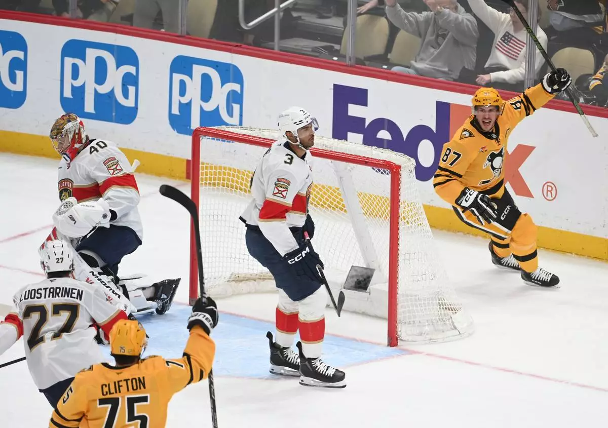 Pittsburgh Penguins center Sidney Crosby (87) celebrates a goal on Florida Panthers goalie Daniil Tarasov (40) as defenseman Connor Clifton (75), center Eetu Luostarinen (27) and defenseman Seth Jones (3) skate nearby during the first period of an NHL hockey game, Sunday, April 5, 2026, in Pittsburgh. (AP Photo/Philip G. Pavely)