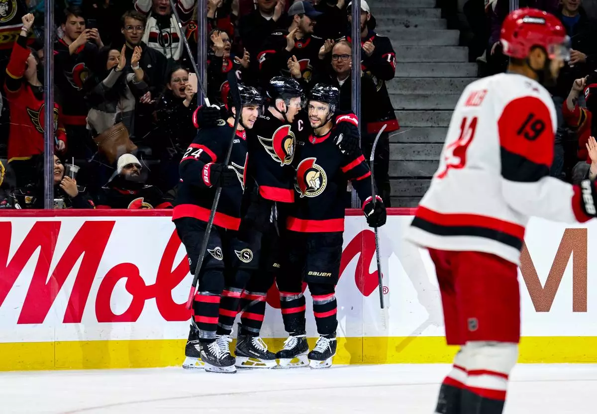 OTTAWA, Ontario (AP) — Brady Tkachuk scored twice and the Ottawa Senators beat the Carolina Hurricanes 6-3 on Sunday night to move into the second wild-card spot in the Eastern Conference.