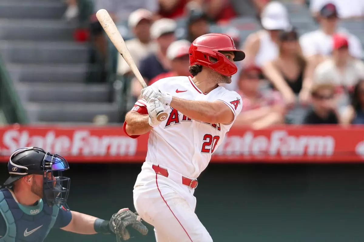 Los Angeles Angels' Adam Frazier follows through on an RBI single during the fifth inning of a baseball game against the Seattle Mariners, Sunday, April 5, 2026, in Anaheim, Calif. (AP Photo/Jessie Alcheh)