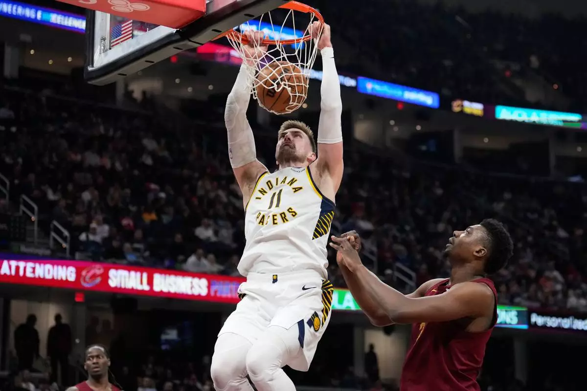 Indiana Pacers center Micah Potter (11) dunks next to Cleveland Cavaliers center Thomas Bryant, right, in the first half of an NBA basketball game in Cleveland, Sunday, April 5, 2026. (AP Photo/Sue Ogrocki)