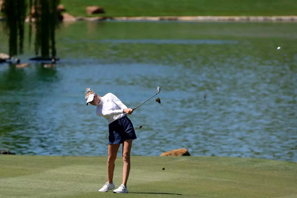 Nelly Korda hits an approach shot on the fourth hole during the final round of the Aramco Championship golf tournament Sunday, April 5, 2026, in North Las Vegas, Nev. (AP Photo/Ian Maule)