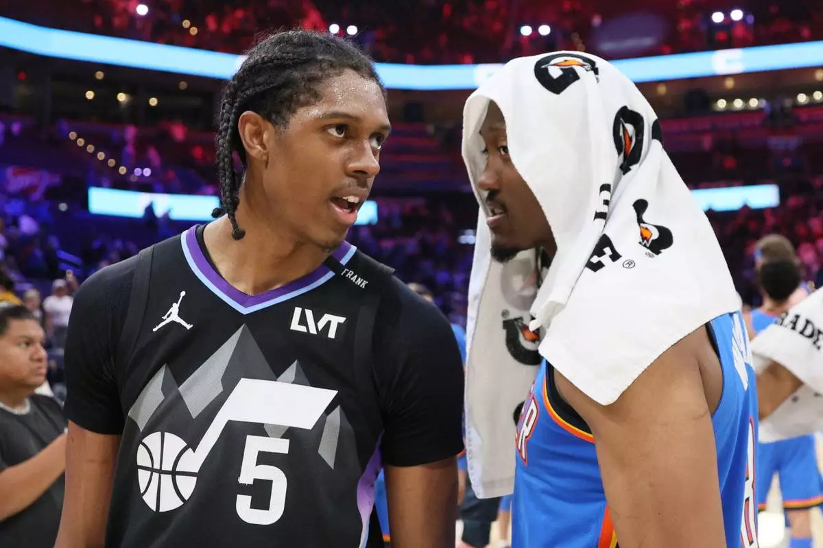 Brothers Utah Jazz forward Cody Williams (5) and Oklahoma City Thunder guard Jalen Williams talk after an NBA basketball game Sunday, April 5, 2026, in Oklahoma City. (AP Photo/Nate Billings)