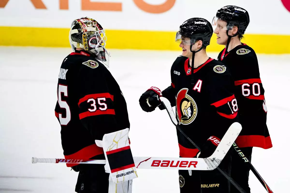 Ottawa Senators goaltender Linus Ullmark (35) celebrates with teammate Tim Stützle (18) after their team's win over the Carolina Hurricanes in an NHL hockey game in Ottawa, Ontario, on Sunday, April 5, 2026. (Spencer Colby/The Canadian Press via AP)