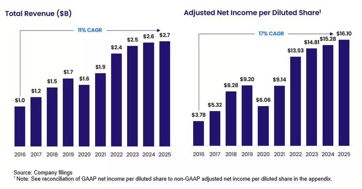 Over the last ten years, we have compounded our revenue by 11% annually, our net income per diluted share by 35% annually and our adjusted net income per diluted share by 17% annually. From 2016 through 2025, our revenue growth exceeded the median of the companies in the performance peer group described in our proxy. And during the last five years, volume in our Corporate Payments business has grown at double-digit rates and transaction volume in Mobility and account growth in our Benefits segment have outpaced our closest peers. We have also achieved healthy margins and delivered strong returns on our increased sales and marketing investment.