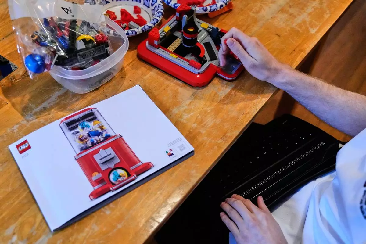 Matthew Shifrin, the founder of Bricks for the Blind, feels for specific pieces while building a LEGO gum ball machine at his family's home, Friday, March 20, 2026, in Newton, Mass. (AP Photo/Charles Krupa)