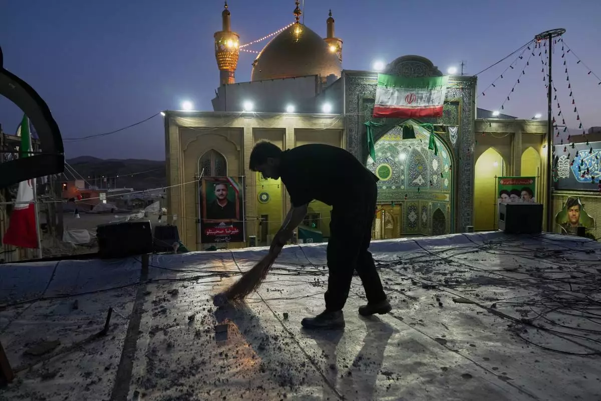 A worker cleans an area within the Grand Hosseiniyeh complex, with the mosque visible in the background, that officials say was hit by U.S.-Israeli airstrikes Tuesday in Zanjan, Iran, Saturday, April 4, 2026. (AP Photo/Francisco Seco)
