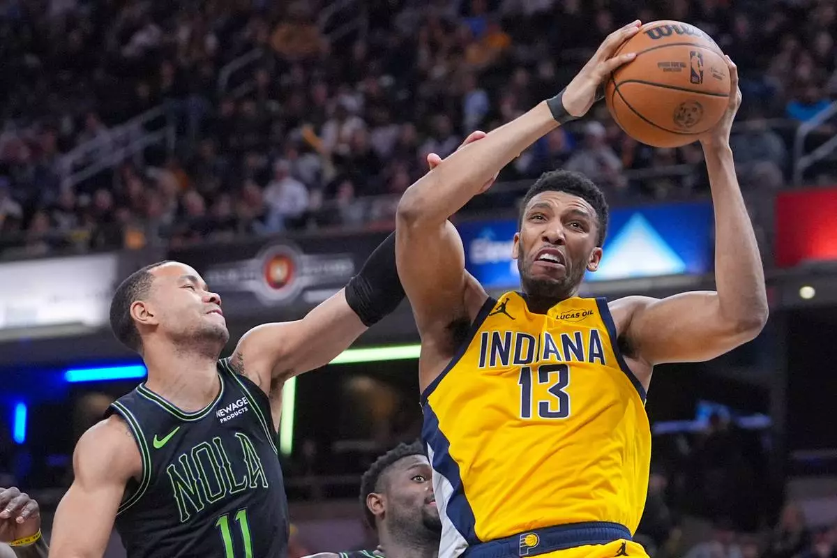 FILE - Indiana Pacers center Tony Bradley (13) is fouled as he rebounds over New Orleans Pelicans guard Bryce McGowens (11) during the second half of an NBA basketball game in Indianapolis, Friday, Jan. 16, 2026. (AP Photo/Michael Conroy, File)