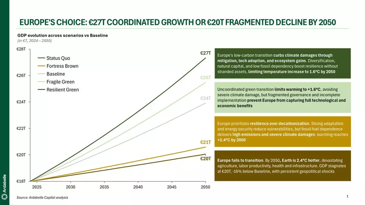 The study shows that the inaction scenario - with GDP stagnating at €20 trillion in 2050 - exposes the continent to compounding climate damages, supply chain disruptions, and strategic dependencies. By contrast, a coordinated trajectory of green transition and industrial resilience would lift GDP to €27 trillion, driven by innovation, energy security, and the reconfiguration of supply chains.