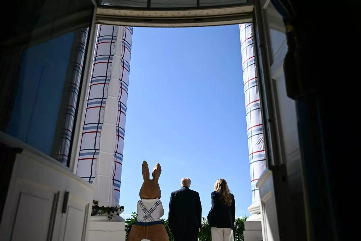 President Donald Trump and first lady Melania Trump participate in the White House Easter Egg Roll on the South Lawn of the White House, Monday, April 6, 2026, in Washington. (AP Photo/Mark Schiefelbein)