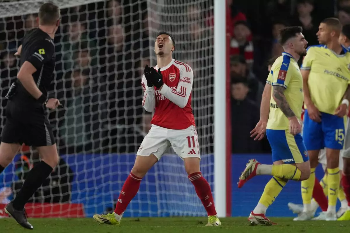 Arsenal's Gabriel Martinelli reacts during the English FA Cup quaterfinal soccer match between Southampton and Arsenal in Southampton, England, Saturday, April 4, 2026. (AP Photo/Dave Shopland)