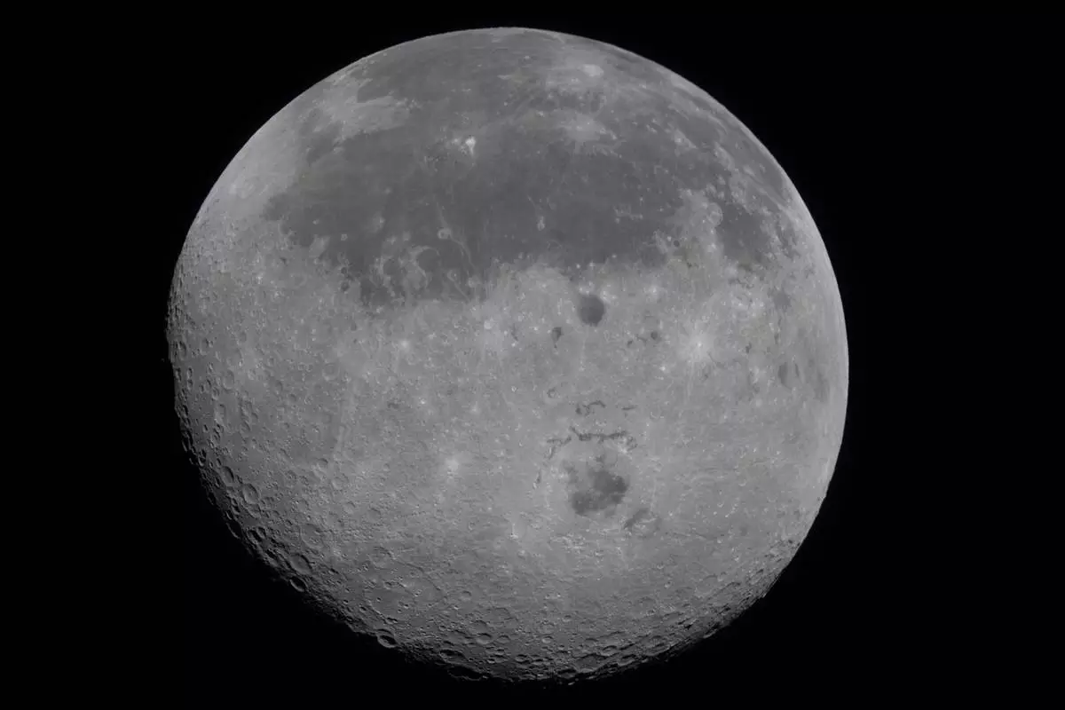 This image provided by NASA Monday, April 6, 2026, shows the Moon, the near side (the hemisphere we see from Earth) visible at the top half of the disk, identifiable by the dark splotches. At the lower center is Orientale basin, a nearly 600-mile-wide crater that straddles the Moon’s near and far sides. Everything below the crater is the far side. (NASA via AP)