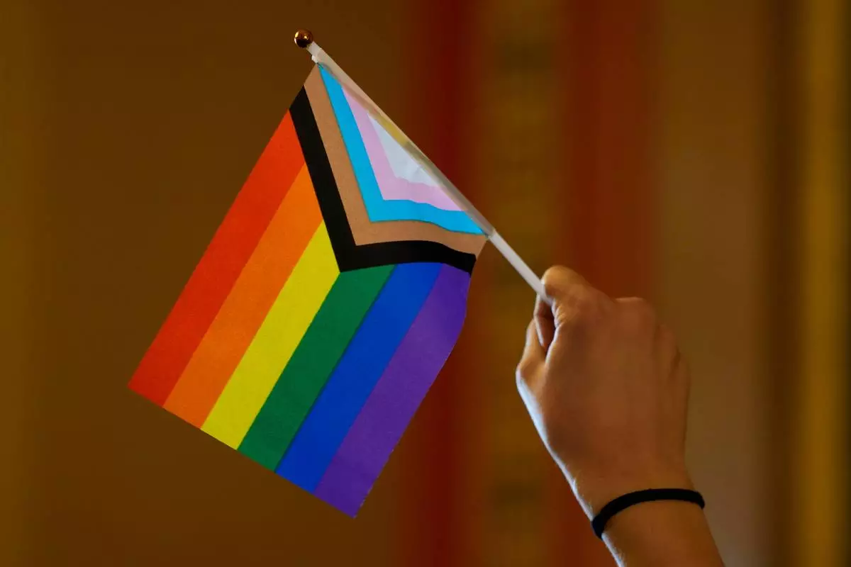 FILE - An LGBTQ+ rights supporter holds a flag in the hallway outside an Iowa House Judiciary subcommittee hearing, Jan. 31, 2024, at the Statehouse, in Des Moines, Iowa. (AP Photo/Charlie Neibergall, File)