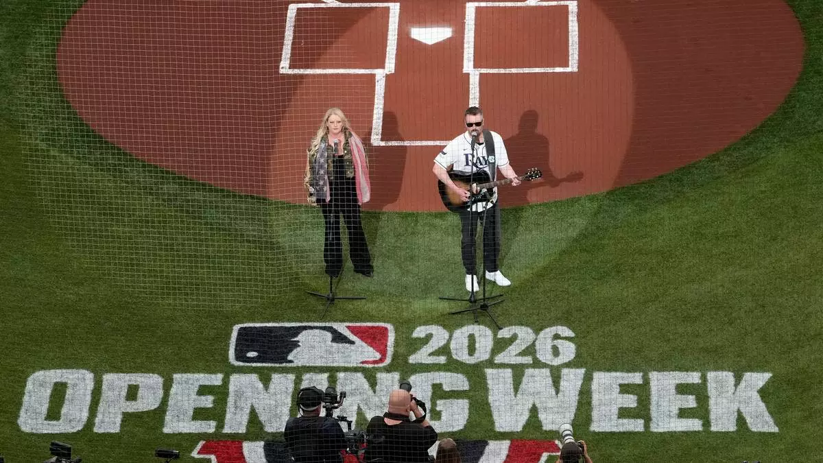 Country musician Eric Church sings the National Anthem before a baseball game between the Tampa Bay Rays and the Chicago Cubs Monday, April 6, 2026, in St. Petersburg, Fla. (AP Photo/Chris O'Meara)