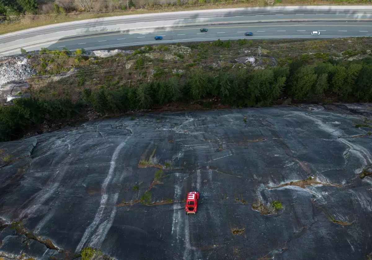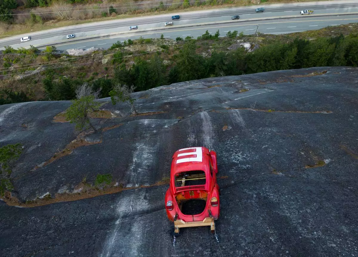 SQUAMISH, British Columbia (AP) — Authorities in British Columbia urged people to stay away from a rock face above a highway in the Canadian province where a red Volkswagen Beetle shell was suspended in an apparent prank by engineering students.