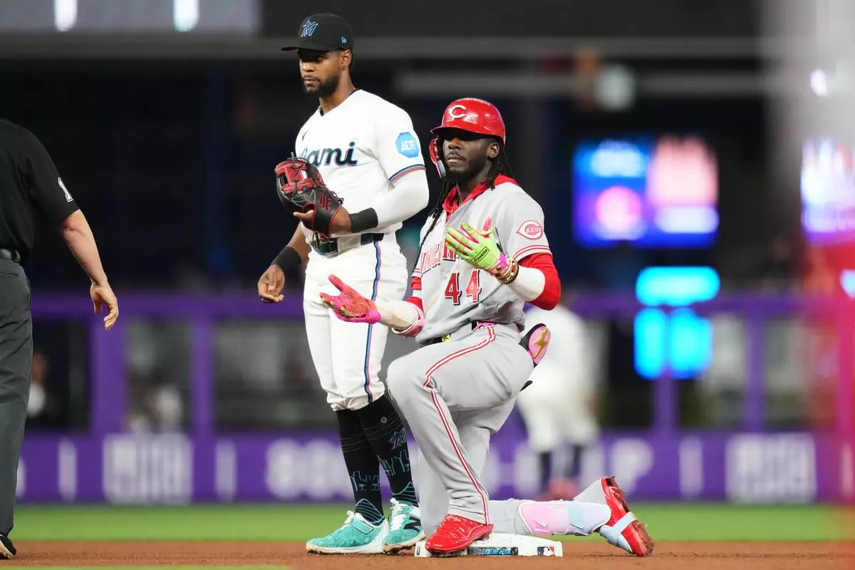 Cincinnati Reds shortstop Elly de la Cruz, right, reacts after hitting a double during the fourth inning of a baseball game against the Miami Marlins, Monday, April 6, 2026, in Miami. (AP Photo/Lynne Sladky)