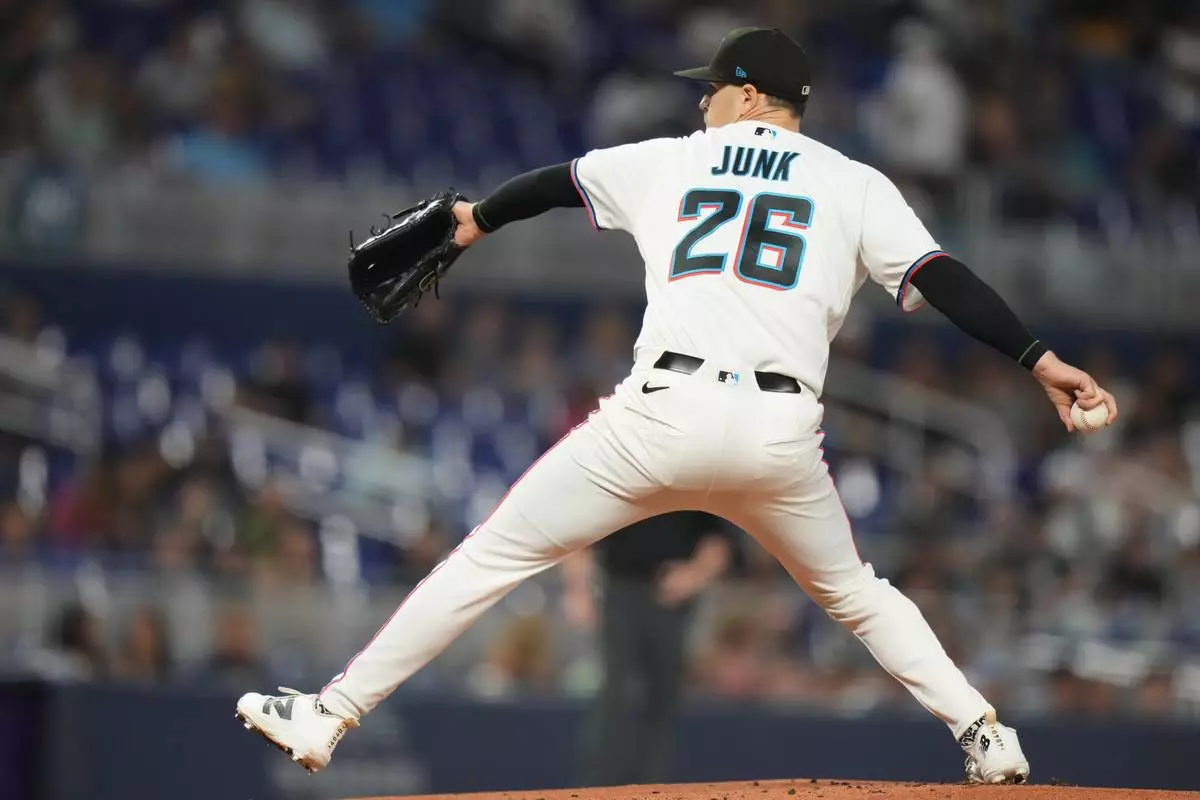 Miami Marlins pitcher Janson Junk (26) throws during the first inning of a baseball game against the Cincinnati Reds, Monday, April 6, 2026, in Miami. (AP Photo/Lynne Sladky)