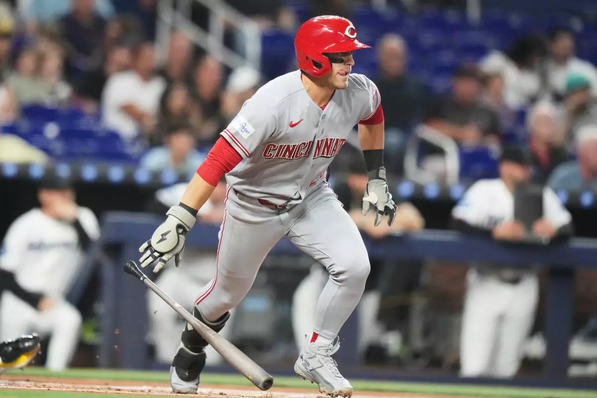 Cincinnati Reds' TJ Friedl runs after hitting a single during the first inning of a baseball game against the Miami Marlins, Monday, April 6, 2026, in Miami. (AP Photo/Lynne Sladky)