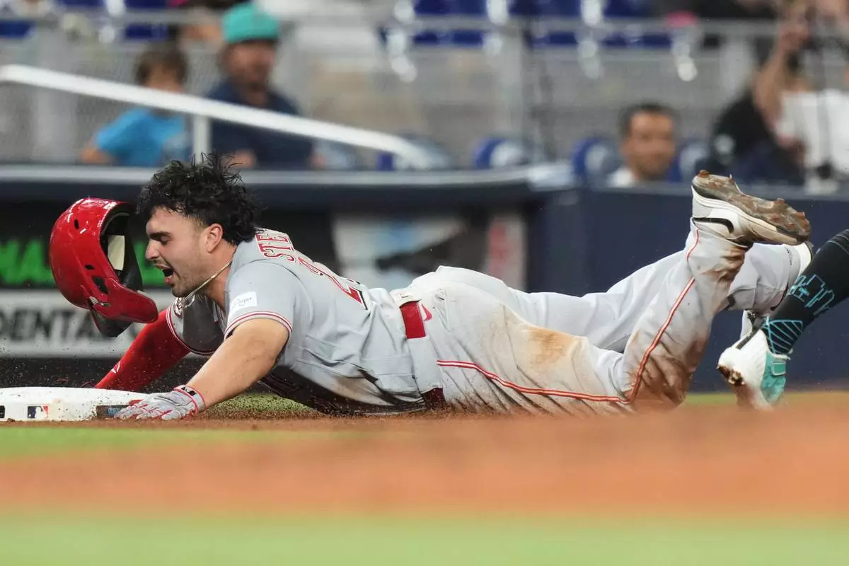 Cincinnati Reds' Sal Stewart is out at third during the fourth inning of a baseball game against the Miami Marlins, Monday, April 6, 2026, in Miami. (AP Photo/Lynne Sladky)