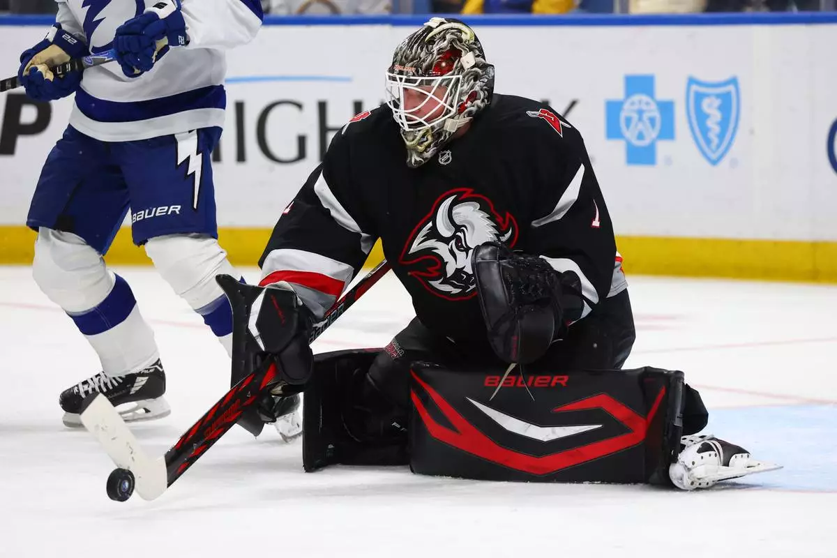 Buffalo Sabres goaltender Ukko-Pekka Luukkonen (1) makes a stick save during the second period of an NHL hockey game against the Tampa Bay Lightning Monday, April 6, 2026, in Buffalo, N.Y. (AP Photo/Jeffrey T. Barnes)