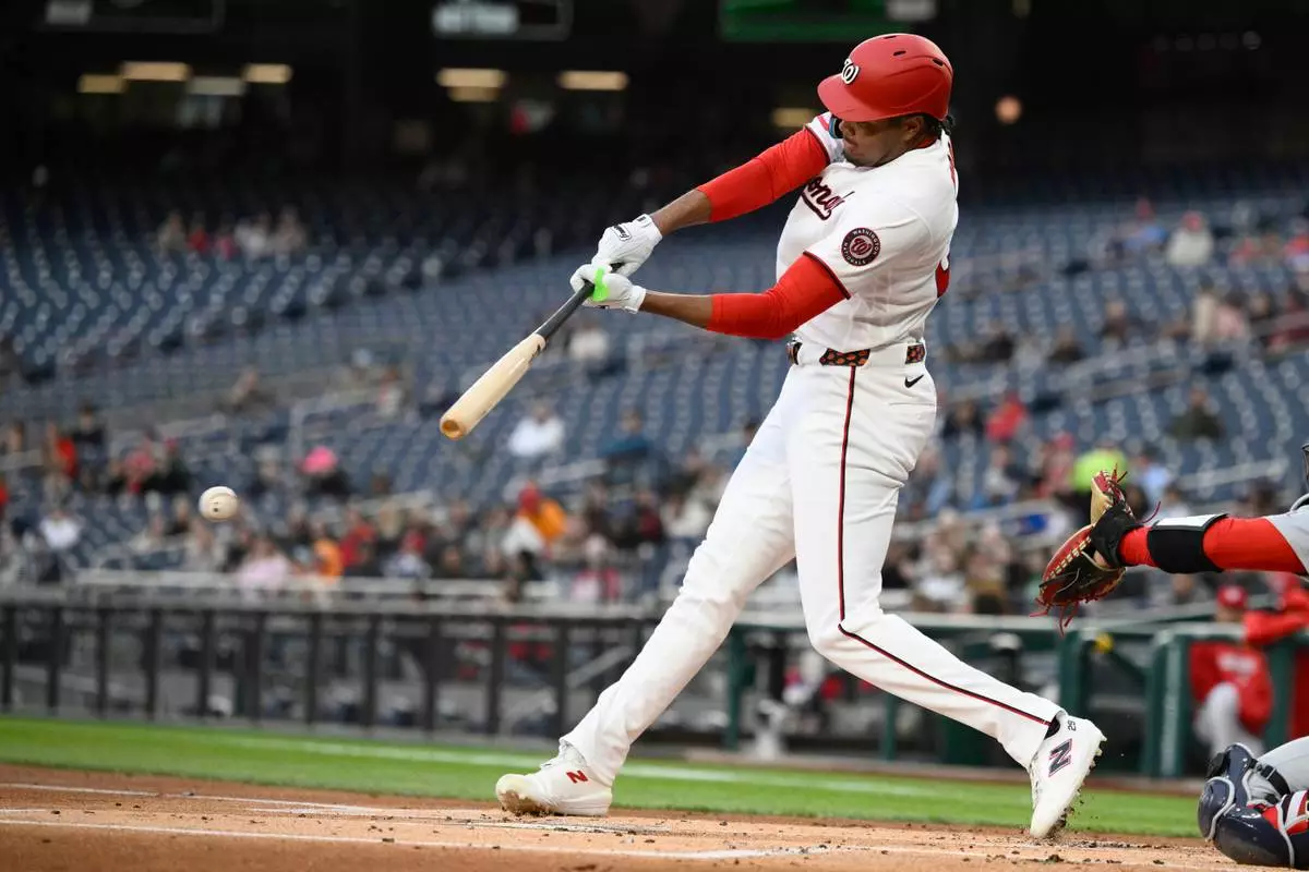 Washington Nationals' James Wood singles during the first inning of a baseball game against the St. Louis Cardinals, Monday, April 6, 2026, in Washington. (AP Photo/Nick Wass)
