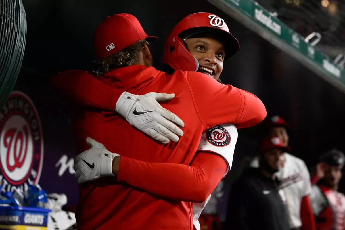 Washington Nationals' CJ Abrams, front right, celebrates after his home run in the dugout during the eighth inning of a baseball game against the St. Louis Cardinals, Monday, April 6, 2026, in Washington. (AP Photo/Nick Wass)