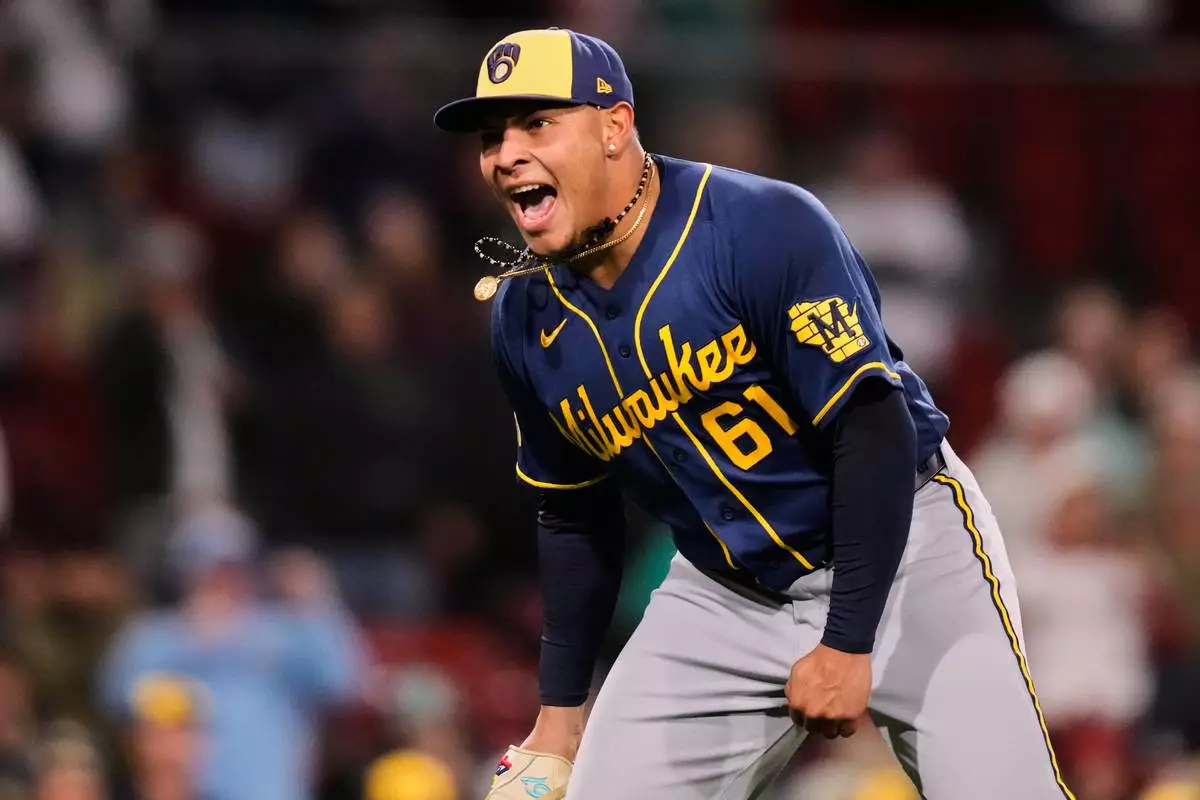 Milwaukee Brewers pitcher Angel Zerpa celebrates after his team defeated the Boston Red Sox in a baseball game at Fenway Park, Monday, April 6, 2026, in Boston. (AP Photo/Charles Krupa)