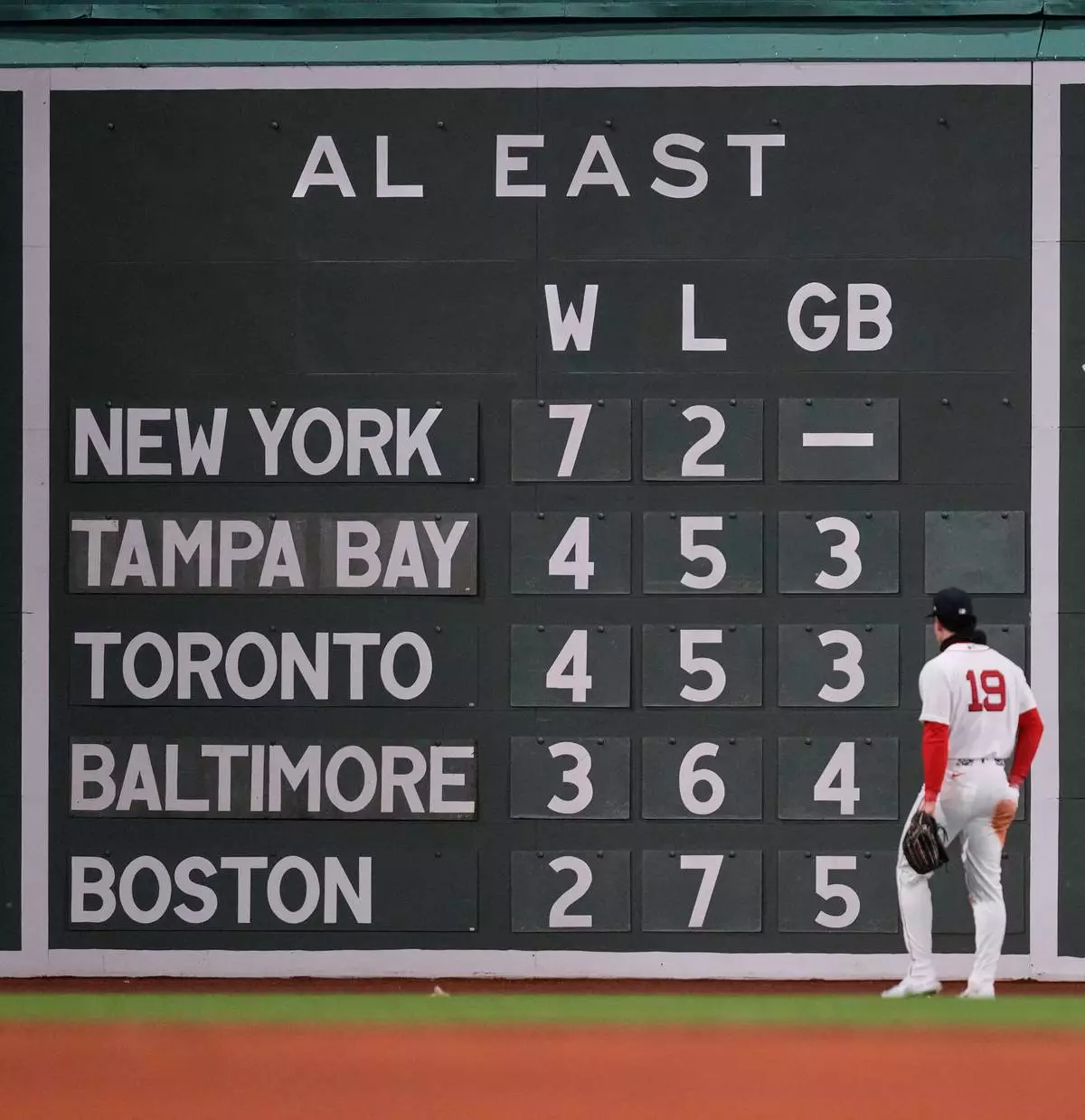 Boston Red Sox left fielder Roman Anthony walks along the warning track, passing the American League East standing board, during a mound visit in the fourth inning of a baseball game against the Milwaukee Brewers at Fenway Park, Monday, April 6, 2026, in Boston. (AP Photo/Charles Krupa)