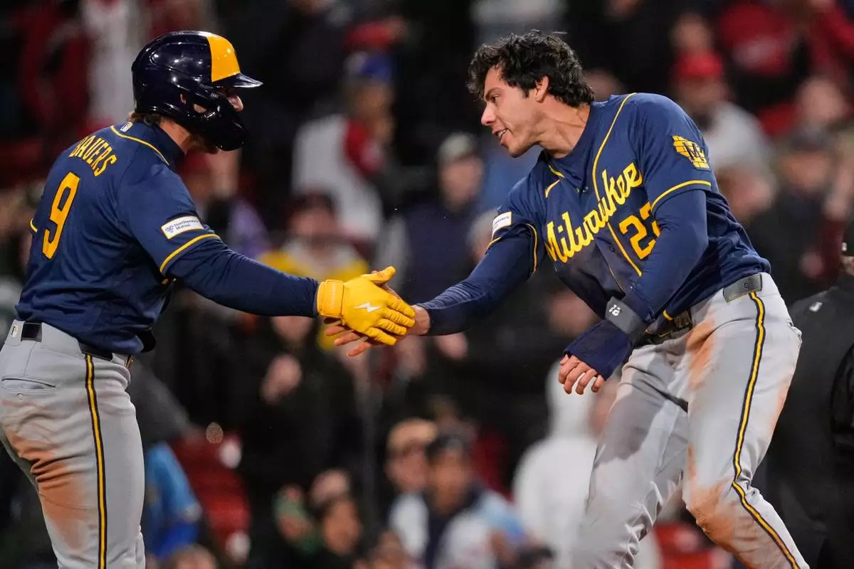 Milwaukee Brewers' Christian Yelich, right, is congratulated by Jake Bauers (9) after scoring on a single by Garrett Mitchell during the eighth inning of a baseball game against the Boston Red Sox at Fenway Park, Monday, April 6, 2026, in Boston. (AP Photo/Charles Krupa)