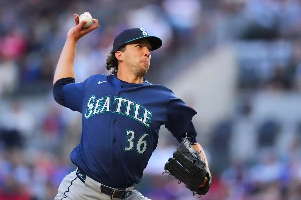 Seattle Mariners starting pitcher Logan Gilbert throws a pitch to the Texas Rangers during the first inning of a baseball game Monday, April 6, 2026, in Arlington, Texas. (AP Photo/Julio Cortez)