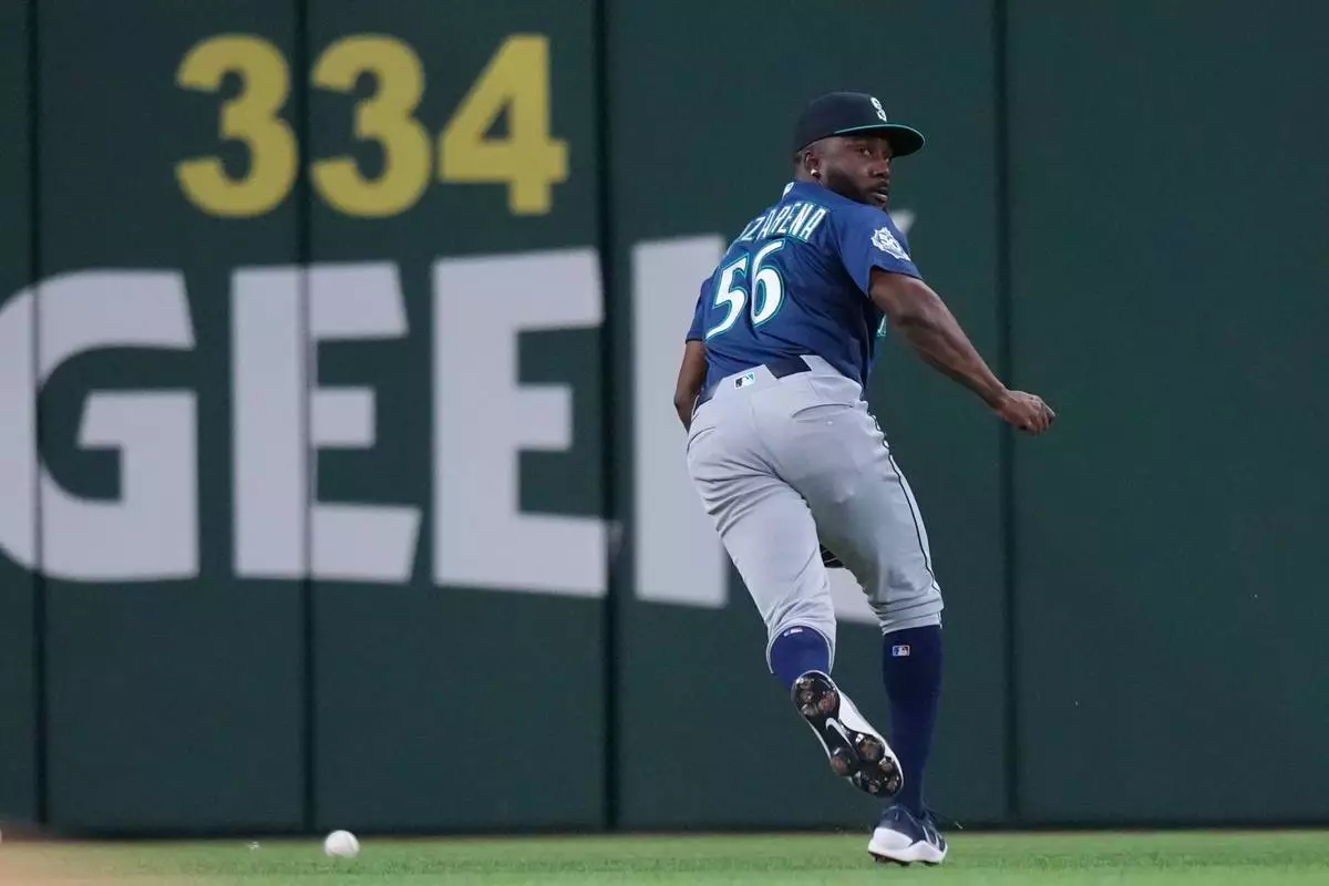Seattle Mariners outfielder Randy Arozarena (56) chases a double by Texas Rangers designated hitter Joc Pederson, not visible, during the fourth inning of a baseball game Monday, April 6, 2026, in Arlington, Texas. (AP Photo/Julio Cortez)