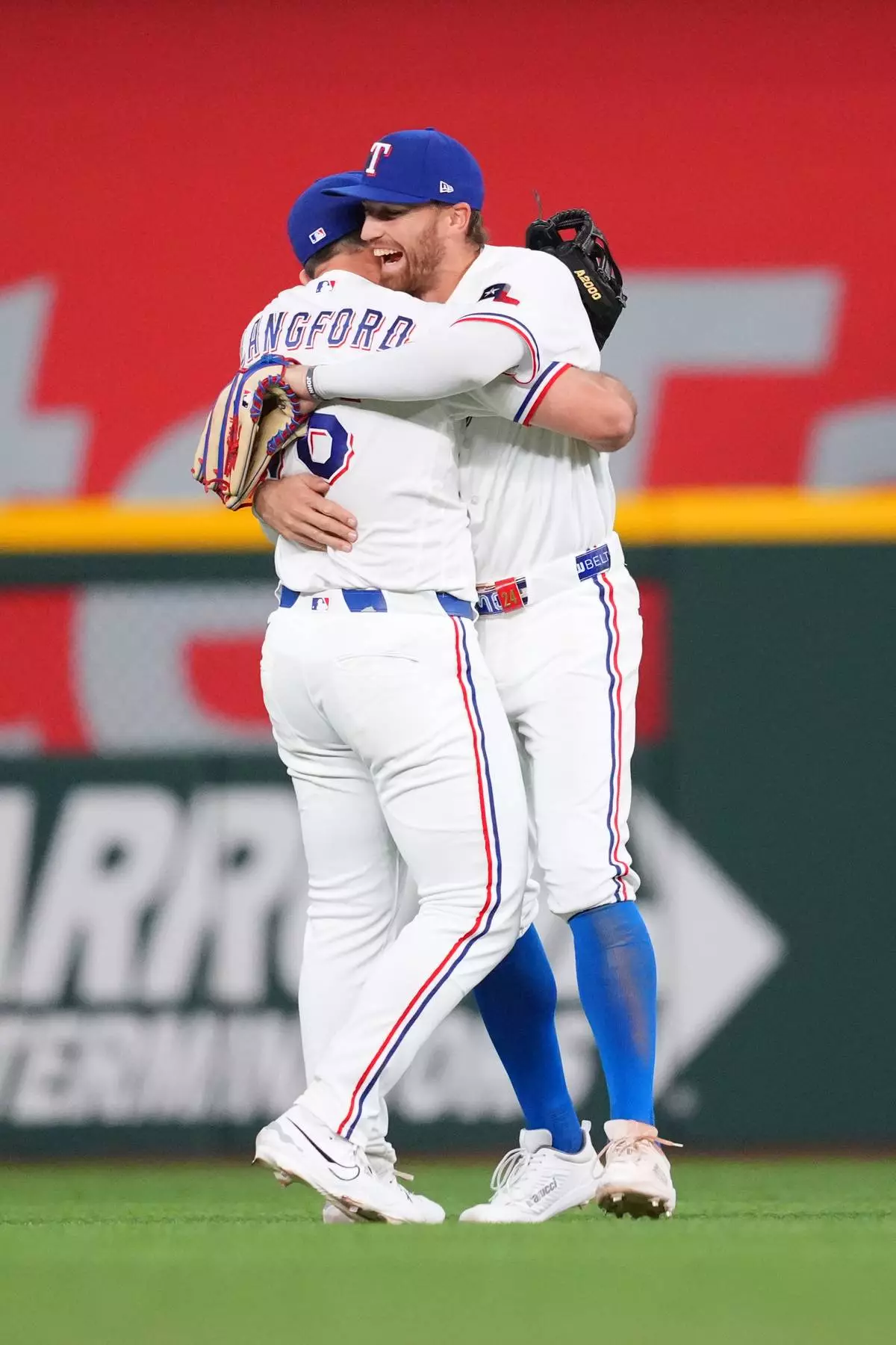Texas Rangers outfielders Wyatt Langford, left, and Brandon Nimmo react after their team defeated the Seattle Mariners 2-1 during a baseball game Monday, April 6, 2026, in Arlington, Texas. (AP Photo/Julio Cortez)