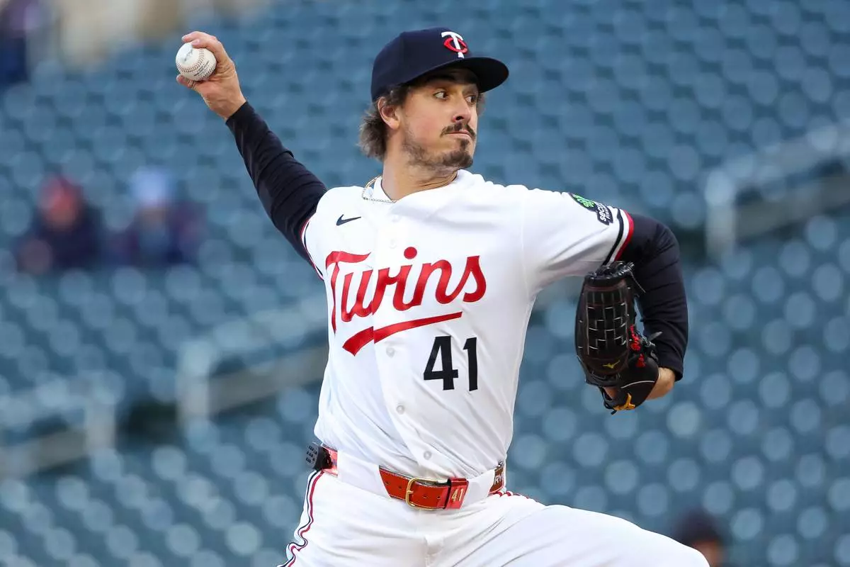 Minnesota Twins starting pitcher Joe Ryan delivers against the Detroit Tigers during the first inning of baseball game Monday, April 6, 2026, in Minneapolis. (AP Photo/Matt Krohn)