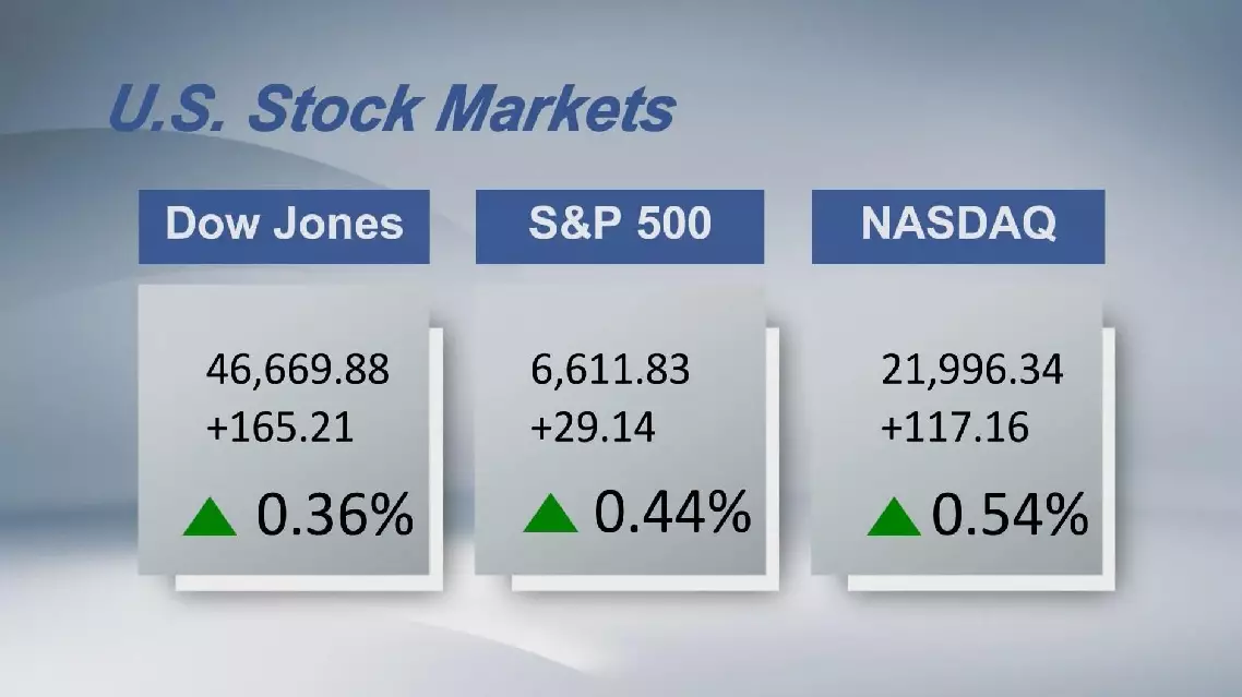 The Dow Jones Industrial Average rose 165.21 points, or 0.36 percent, to 46,669.88. The S&P 500 added 29.14 points, or 0.44 percent, to 6,611.83. The Nasdaq Composite Index increased by 117.16 points, or 0.54 percent, to 21,996.34.