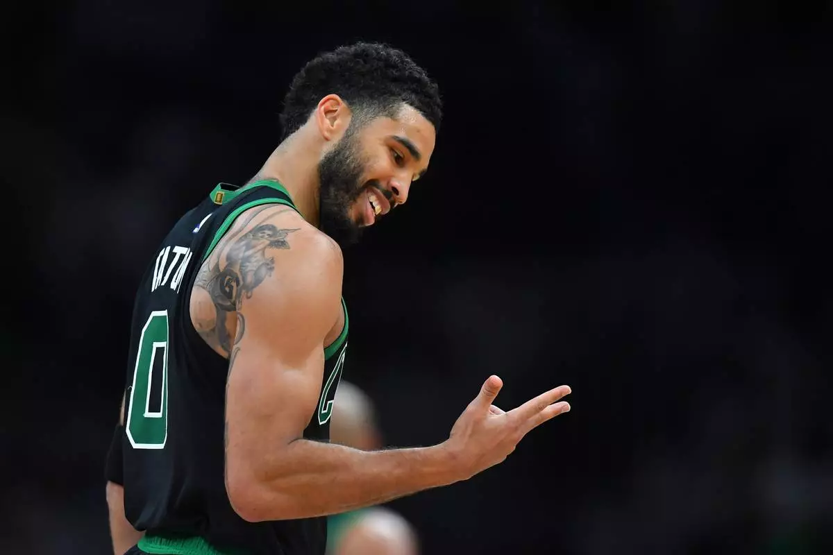 Boston Celtics forward Jayson Tatum celebrates after scoring in the first half of an NBA basketball game against the Toronto Raptors, Sunday, April 5, 2026, in Boston. (AP Photo/Steven Senne)