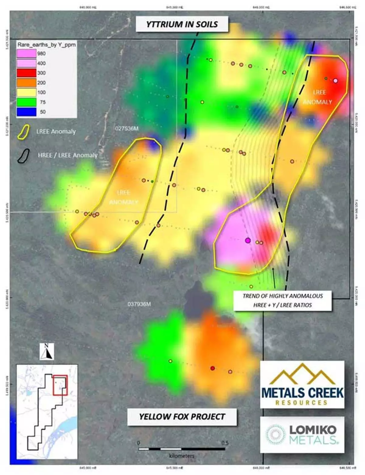 These results are from additional REE analysis from the Phase II soil sampling and prospecting program (See News Release September 23, 2025) on the Yellow Fox Antimony property and follow-up to the initial 7 samples assayed for REE’s (See News release January 14, 2026). Lomiko acquired the Yellow Fox Project from Metals Creek in 2025. (See MEK news release dated January 21 st, 2025).