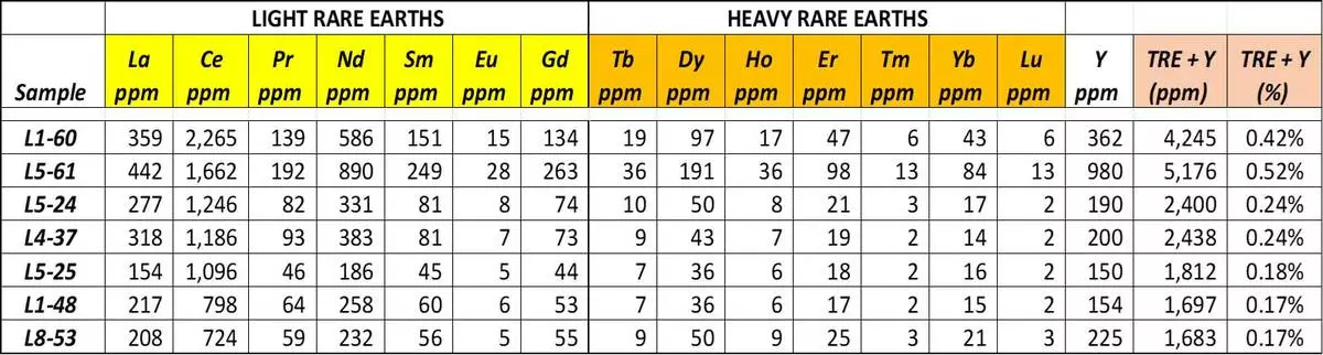 Table 1 -Initial 7 sample Re-Run Soil Samples with Rare Earth Assay Package