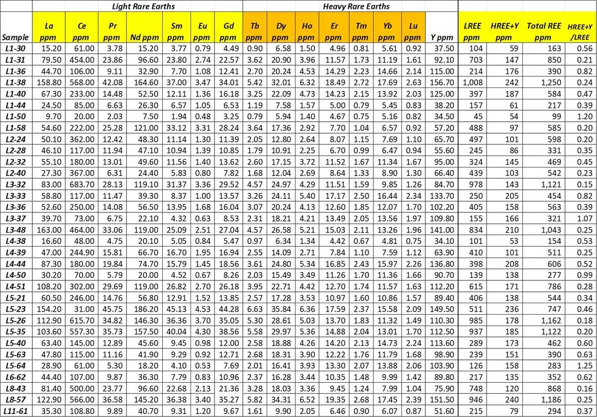 Results from these 32 assays (See Table 2) continue to exhibit strong LREE enrichment (La-Ce-Pr-Nd-Eu) accompanied by highly elevated HREE (Dy-Tb-Ho-Er-Tm-Yb-Lu), including Yttrium (Y), over a minimum length of 1200m, indicating a mixed LREE and HREE mineralized system hosted by what is interpreted to be a highly fractionated peralkaline granite. These peralkaline granites are considered to be one of the primary hosts for HREE enriched systems. Assays revealed an enriched REE system with highly anomalous HREEs, including Dysprosium (Dy) and Terbium (Tb), with select samples up to 10 to 20 times background (See Figure 1).