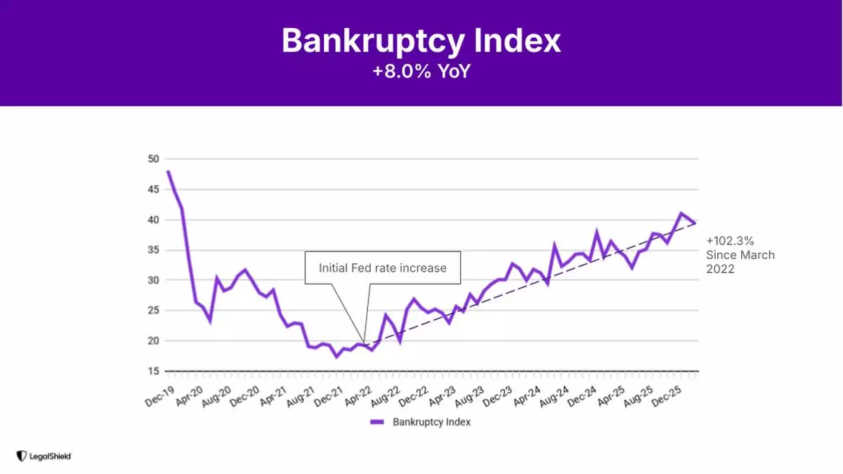 “The Bankruptcy Index has been steadily climbing since the initial Federal Reserve rate increase in March 2022 and is now more than double its level from that period,” said Matt Layton, senior vice president of Consumer Analytics for LegalShield. “That sustained trajectory is a forward-looking signal. Based on the historical lead time between our intake data and actual court filings, we expect bankruptcy filings to rise meaningfully through mid-2026..”