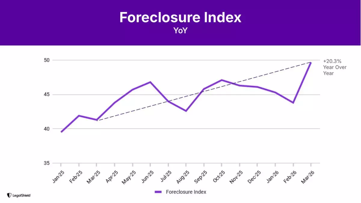 American homeowners are reaching a breaking point. Foreclosure-related legal requests surged to their highest level since March 2020 in the first quarter of 2026, according to the LegalShield Consumer Stress Legal Index (CSLI), a proprietary measure of real consumer legal behavior built on more than 150,000 attorney calls per month. The Foreclosure Index jumped 13.4% in March alone and is up 20.3% over the past year, a pace that reflects households moving from financial worry to legal action.