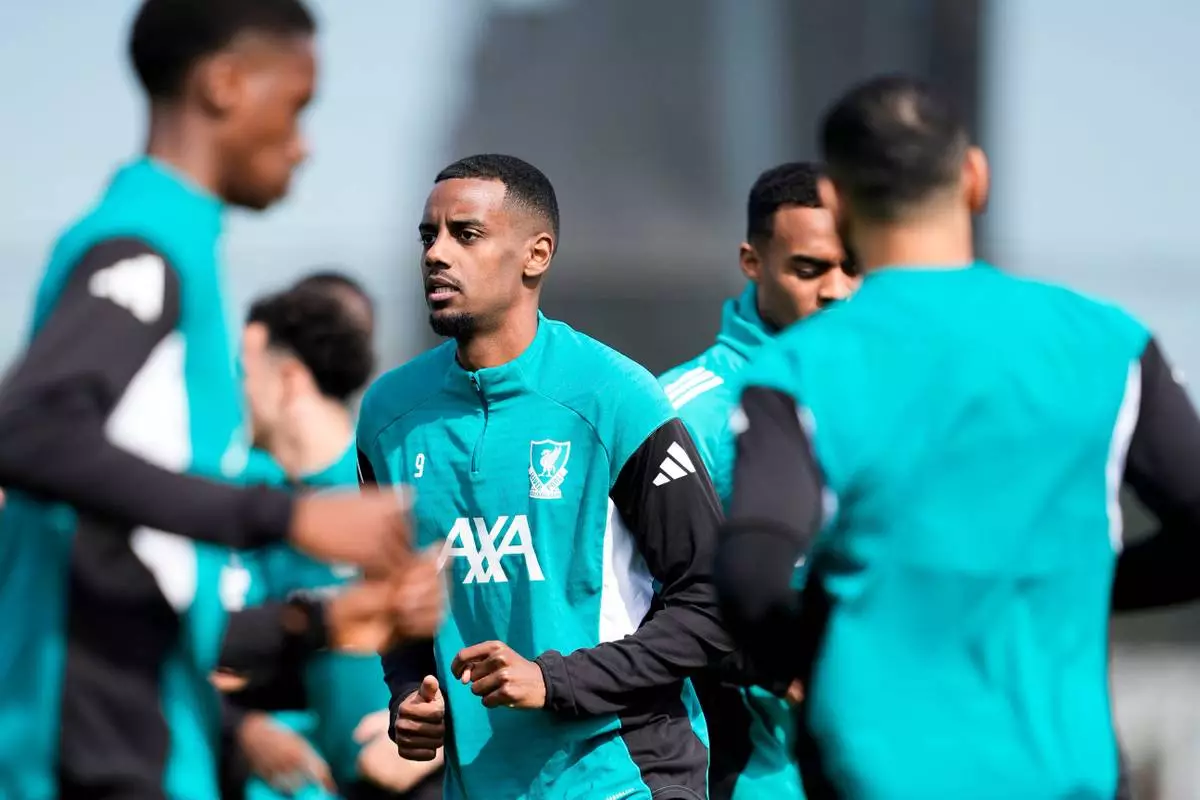 Liverpool's Alexander Isak attends a training session in Liverpool, England, Tuesday April 7, 2026. (Peter Byrne/PA via AP)